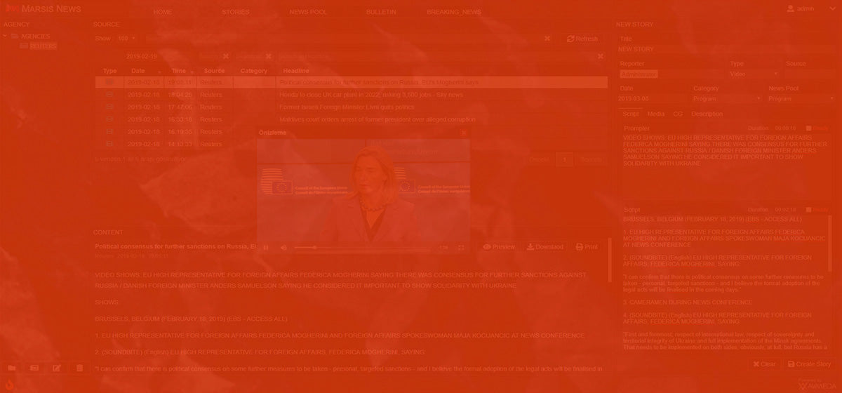 Marsis News integrated with major international / local news agencies like Reuters, Associated Press, DHA, IHA etc. Marsis News can control and manage Marsis Playout and CG as well as Third Party playouts and on air graphic systems.