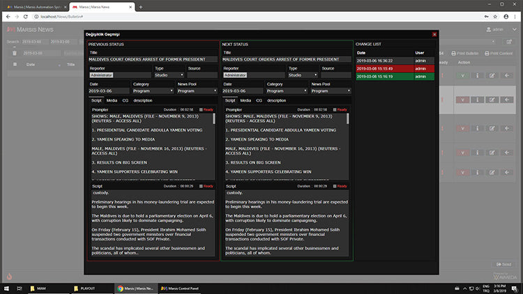 Marsis News allows Chief Editors to oversee all changes in the story including Script - Text - CG and Videos. System Admin can pull all necessary user and history logs for a specific time, user or news ID.