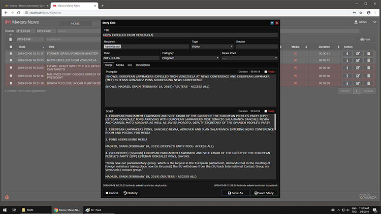 Marsis News integrated with major international / local news agencies like Reuters, Associated Press, DHA, IHA etc. Marsis News can control and manage Marsis Playout and CG as well as Third Party playouts and on air graphic systems.