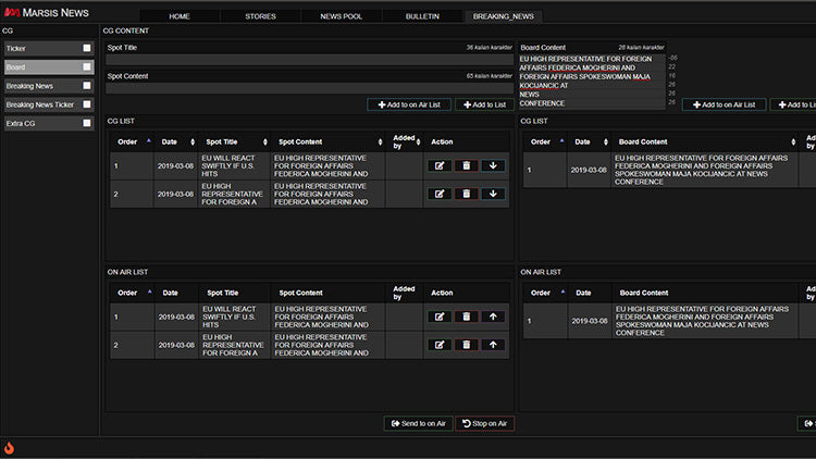 Marsis News offers total control on Air Graphics. Editors can manage all content including Ticker, Breaking News Ticker, Breaking News Spot and Split Screen Graphics. Editors can handle all graphic elements from their Marsis News CG tab.