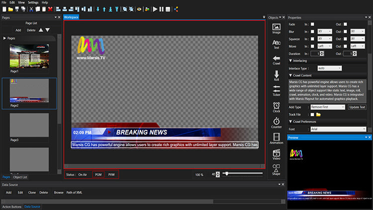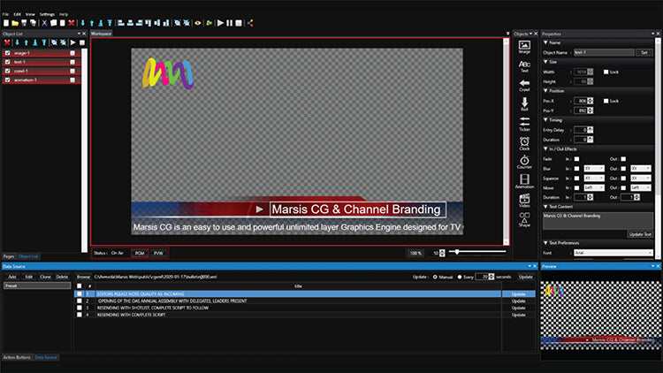 Marsis CG, XML, RSS beslemeleri veya Metin nesneleri gibi birden fazla kaynaktan veri çekebilir. Ticker'lar, Rulolar, Taramalar otomatik içerik güncellemesi için üçüncü taraf veri kaynağıyla entegre edilebilir.
