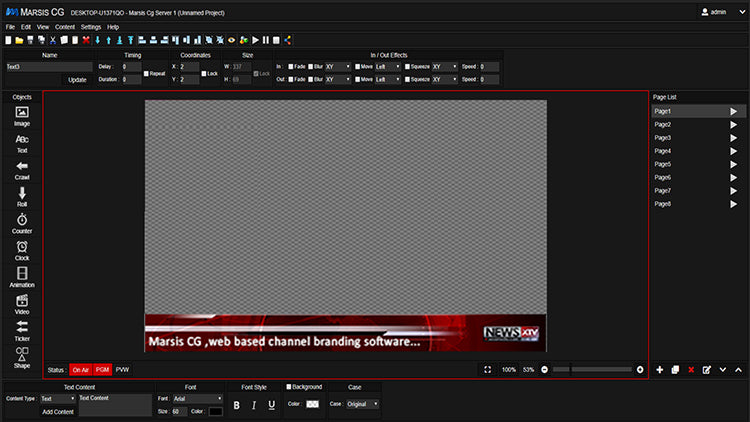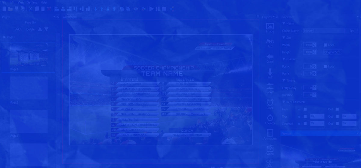Çoklu NesnelerResim, Ticker, Metin, Tarama, Afiş, Animasyon, Saat, Sayaçlar, Video (alfa kanalı destekli MOV) ve Şekiller gibi çoklu CG nesneleri