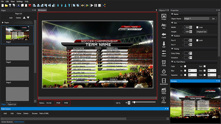 Grafik NesnelerResim, Ticker, Metin, Tarama, Afiş, Animasyon, Saat, Sayaçlar, Video (alfa kanalı destekli MOV) ve Şekiller gibi çoklu CG nesneleri